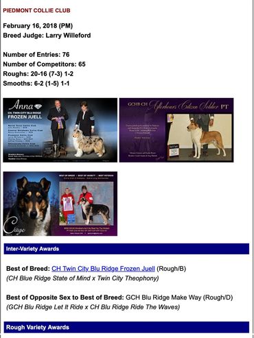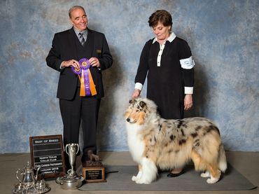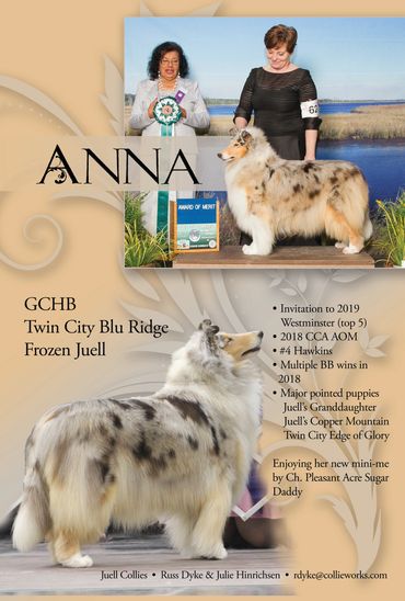 Anna has set the standard of our vision for our collies. Her sweet expression combined with her exquisite head detail, top line, flowing coat, and eye catching outline exemplifies our interpretation of the collie standard. We are very thankful to Dona Williams, and Taylor Lafferty for their exceptional presentation of Anna through the years. We are humbled and honored by the many awards presented to Anna by many of the elite breeder judges in collies.